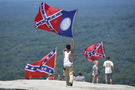 Apart from that group, the rally did draw individuals opposed to the flag and curious – or brave – enough to mingle and debate, including one black man who showed up in rags and claimed to be dressed like a slave.