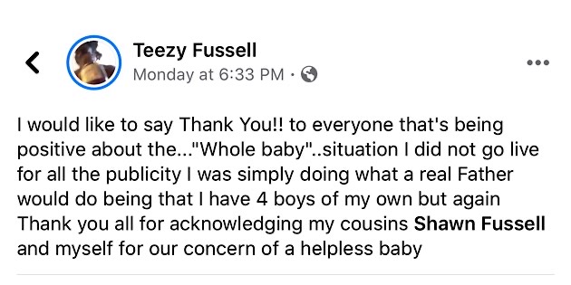 In a radio interview with 106.9 The Buck, Shawn Fussell said, “The mother reached out to me and said thank you, plenty of times, they all did, there were a lot of emotions going on. She reached out again on Facebook to say thank you. We just wanted to help. We saw a baby on the side of the road and we gotta help. We did something every human being should do.”