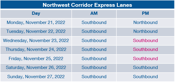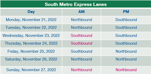 Below are the adjusted schedules for the South Metro Express Lanes and the Northwest Corridor Express Lanes. Pink text indicates a change in schedule.