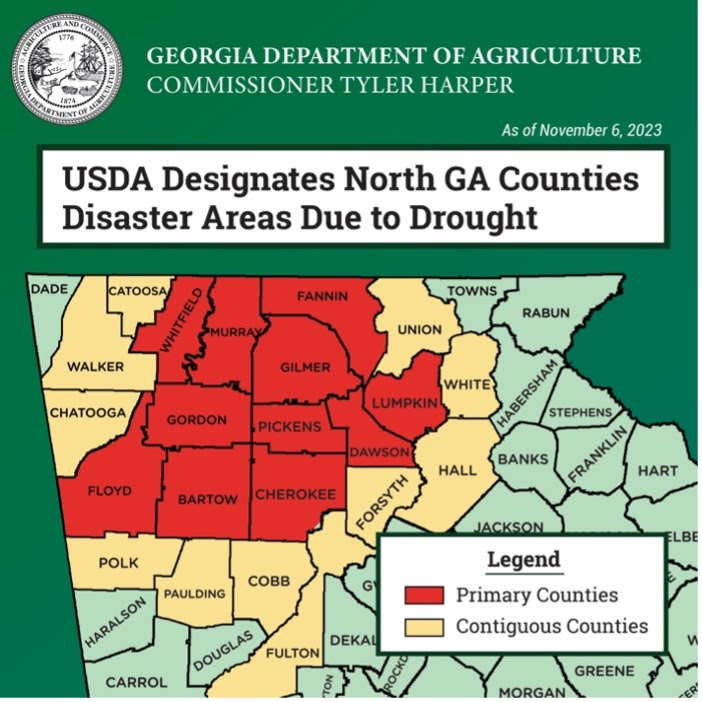 “The addition of these 11 North Georgia Counties to last week’s Natural Disaster Declaration is a welcomed source of relief for farmers facing severe drought conditions, and I want to thank Secretary Vilsack for again recognizing the importance of delivering this essential relief,” said Agriculture Commissioner Tyler Harper. “I know firsthand the impact drought conditions can have on our agriculture industry, especially those with dryland operations, and our team will do everything possible to help those hardest hit during recover.”