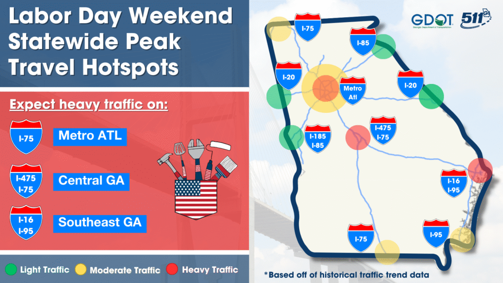 Georgia DOT has analyzed Labor Day travel data from 2024 and predicts the following traffic flow patterns during this year’s holiday weekend from Wednesday, August 27 to Tuesday, September 2, 2025.