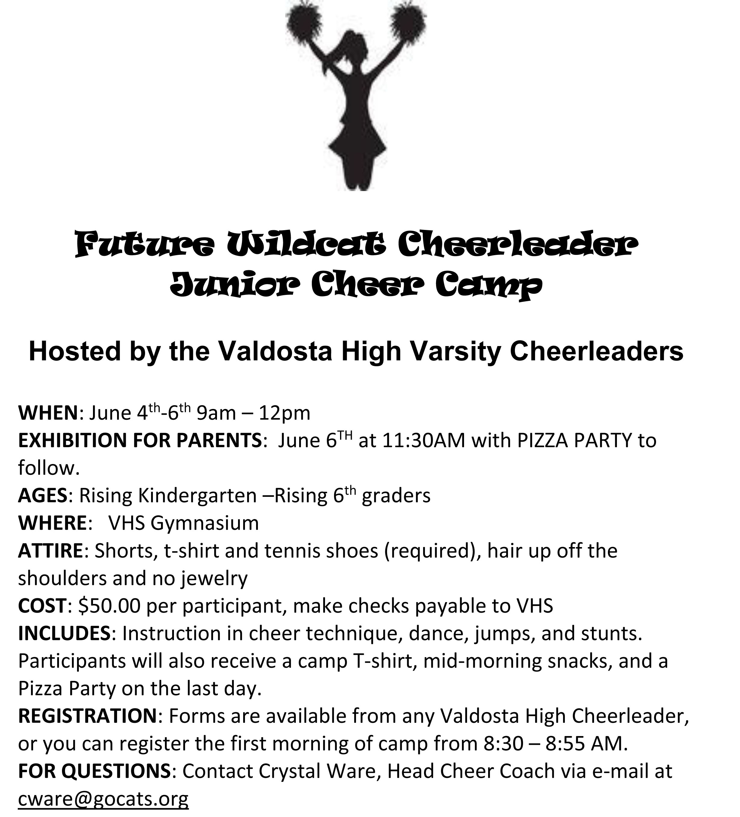 Valdosta High will also hold a Future Wildcat Cheerleader Junior Cheer Camp on June 4th-6th. It will be for kids from rising kindergarten-rising 6th graders. The camp will cost $50 for each participant. Forms for the camp are available from any Valdosta cheerleader or you can register the morning of the camp.