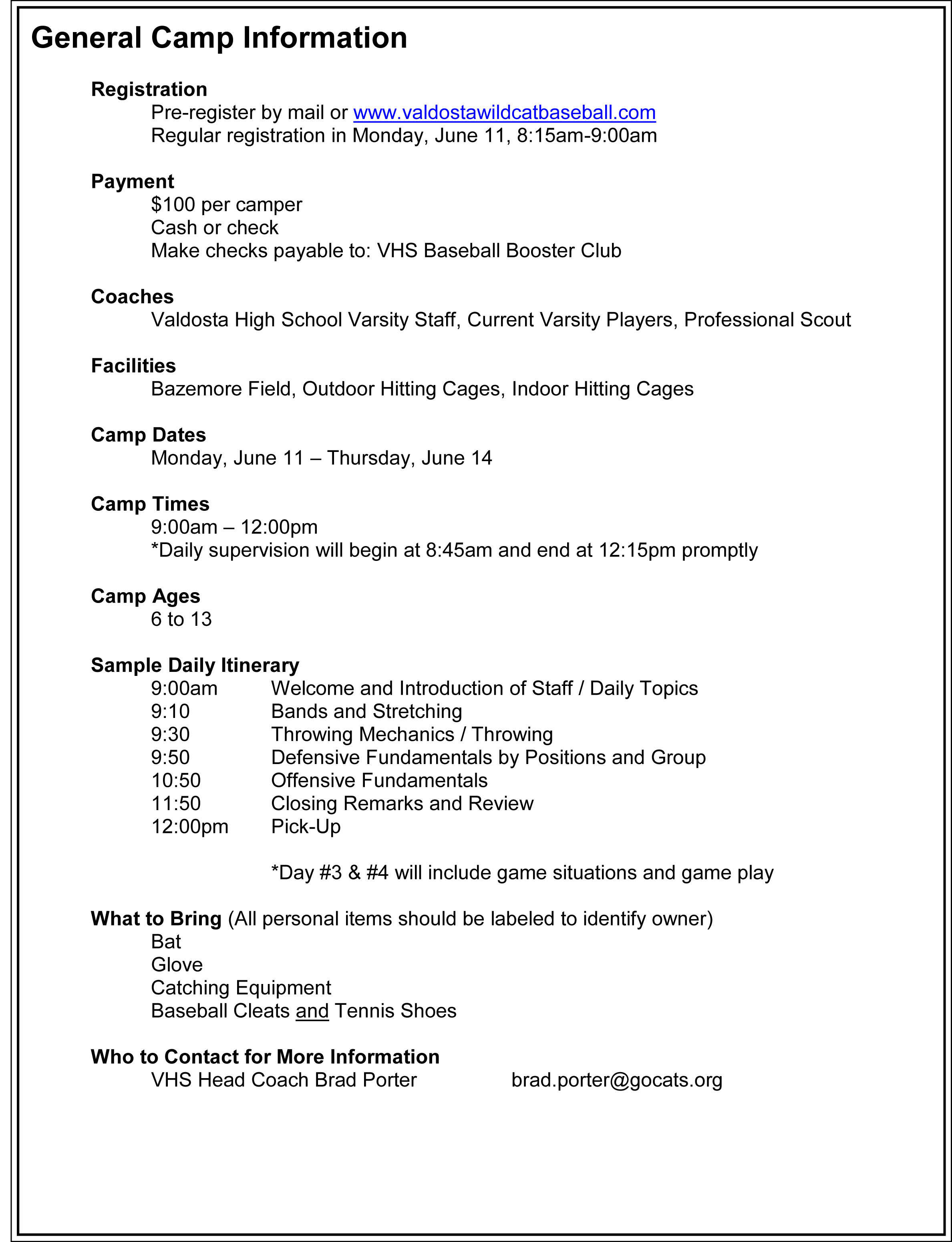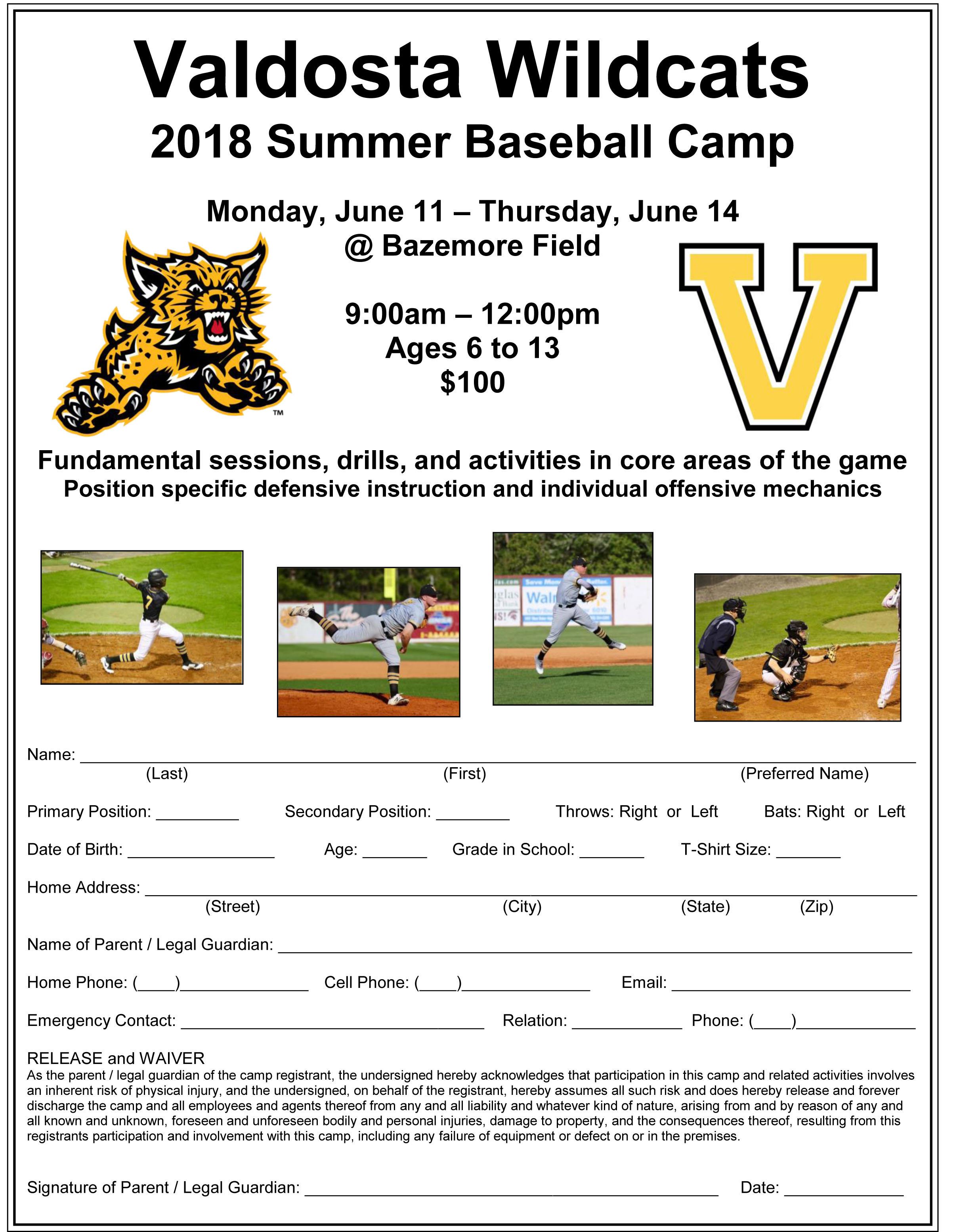 The Valdosta High baseball camp will be Monday, June 11th through Thursday, June 14th. The camp will be for kids ages 6-13 and will be $100 per camper. Registration can be done online at https://www.valdostawildcatbaseball.com/.