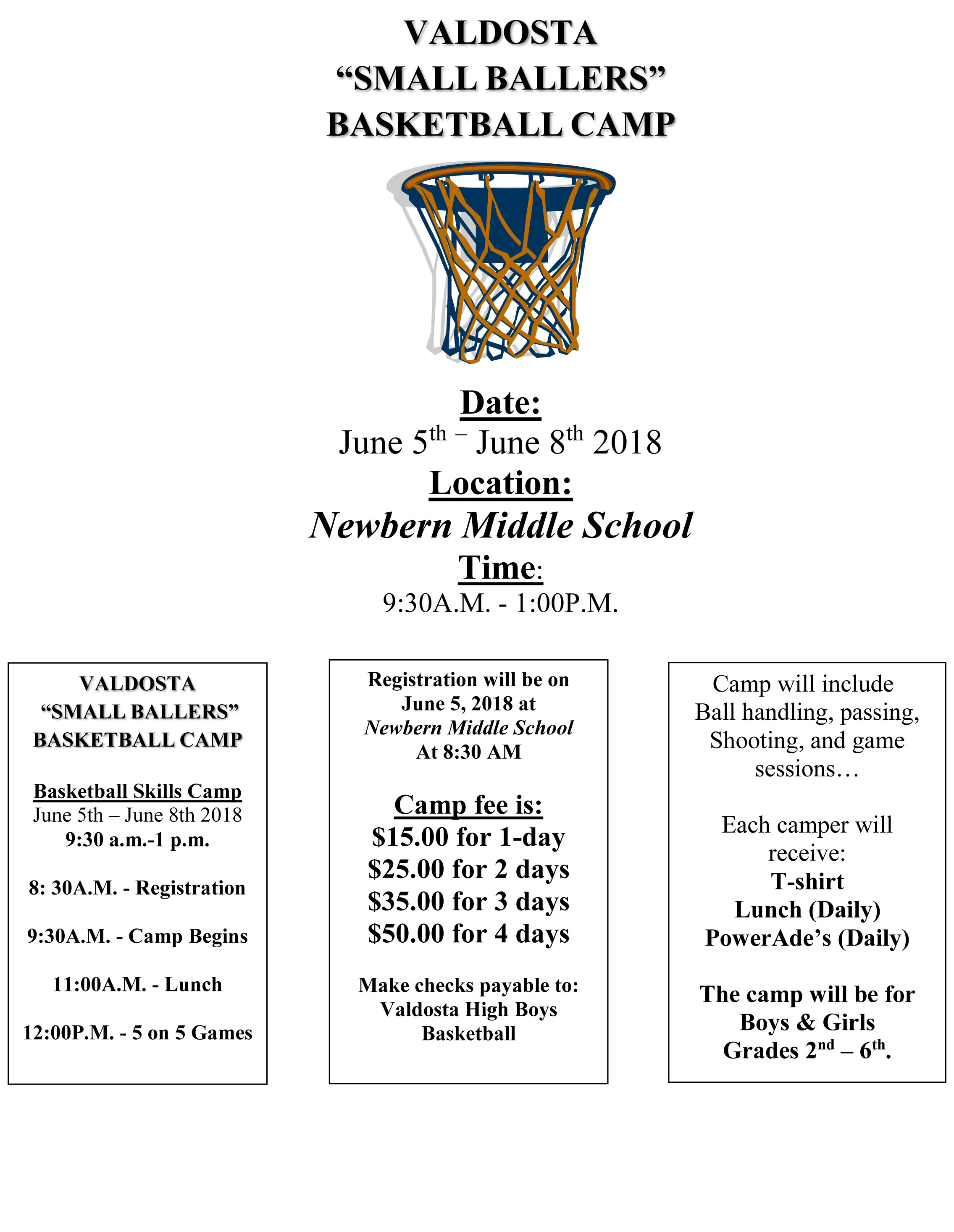 Newbern Middle School will hold a “Small Ballers” basketball camp on June 5th-8th from 9:30 a.m.-1 p.m. This camp will be for boys and girls in the 2nd-6th grade. The camp will cost $15 for one day, $25 for 2 days, $35 for 3 days or $50 for all 4 days.