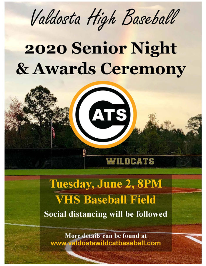 Local SportsMay 28, 2020 VHS baseball hosts ‘Senior Night’ June 2 Share with friends Valdosta High baseball will host a 2020 Senior Night and Awards Ceremony on Tuesday, June 2, 2020 at 8:00 PM. Social distancing will be observed throughout the event. For more on Wildcats Baseball, visit https://www.valdostawildcatbaseball.com. TAGS: awardballbaseceremonydistancingnighthighschoolseniorsocialvaldostavhswildcats Related posts Vikings take on Camden County…Vikings to host Tift County…VSU men’s golf team finishes…VCS releases information for Wildcat…Vikings to take on Colquitt…Community invited to Valdosta Volleyball…Vikings to have an open…VCS announces Swim Team Interest…Vikings Homecoming game tickets are…Vikings take on Longhorns during…