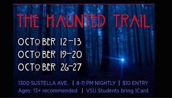 Valdosta State University Press Release: VALDOSTA — Valdosta State University Campus Recreation presents The Haunted Trail from 8 p.m. to 11 p.m. Oct. 19-21 and Oct. 27-29 at the Center for Outdoor Recreational Experiences Challenge Course. Due to the…