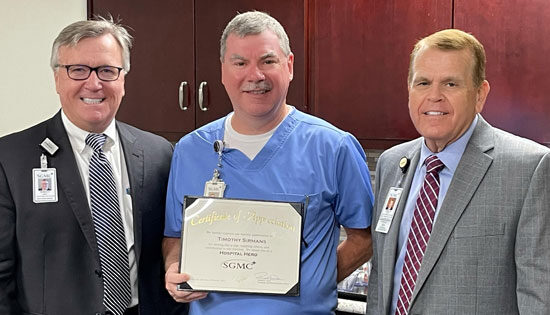 Photo: President and Chief Executive Officer Ronald E. Dean, Tim Sirmans and Chief Nursing Officer/Chief Operating Officer Randy Smith Release: South Georgia Medical Center honored Tim Sirmans, charge nurse, as the hospital hero at the…