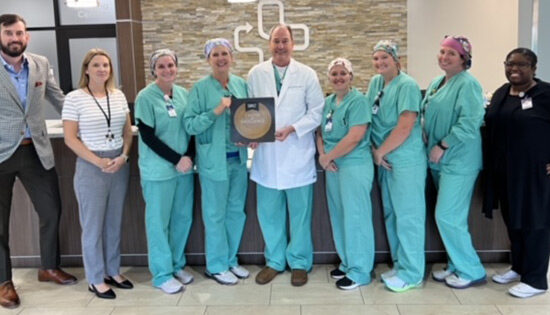 Photo: Dr. Joe Clifton (center in white coat) and his team from Southwell Medical in Adel hold the seal designating the hospital as a Center of Excellence in Minimally Invasive Gynecology ADEL - Southwell Medical…